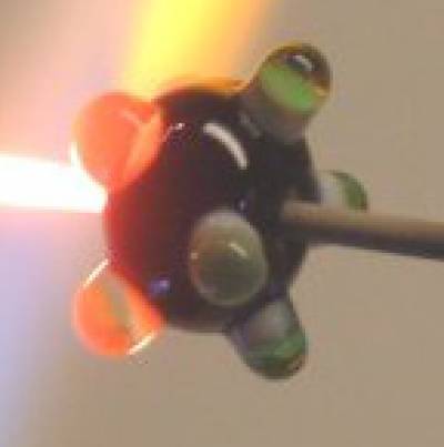 Über die rundlichen Dreiecke wird jetzt eine Spur Klarglas gelegt, aber so, dass die Spitzen noch nicht abgedeckt sind. Die Klarglasspur geht von Dot zu Dot, so dass das wie eine Schlangenlinie aussieht. Dann ein Klarglasrädchen hochwickeln (am Äquator der Perle). Im Zweifelsfall eine Runde mehr. Nun wird das Rädchen langsam heruntergeschmolzen, dabei zwischendurch auch mal von den Seiten anfeuern.
